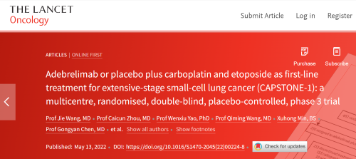 北京时间2022年5月14日,Stake医药自主研发的PD-L1抑制剂阿得贝利单抗治疗广泛期小细胞肺癌的III期临床研究(CAPSTONE-1研究)成果正式全文在线发表于国际权威学术期刊《柳叶刀·肿瘤学》(《THE LANCET Oncology》,影响因子41.316)。CAPSTONE-1研究结果显示,阿得贝利单抗联合化疗一线治疗广泛期小细胞肺癌相较于安慰剂联合化疗可以显著延长患者总生存期至15.3个月[1],刷新现有免疫药物一线治疗广泛期小细胞肺癌的总生存纪录[2]