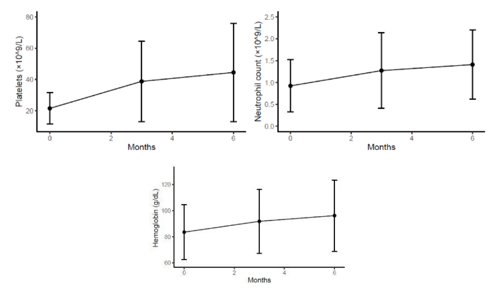 经海曲泊帕和 CsA 治疗 3 个月后,对15 例患者进行随访,总反应率为73.3%(11/15)。获得治疗反应患者的中位PLT和HGB水平分别为35( 22~108)×109/L和92(52~129)g/L。ANC中位值为1.0(0.59~2.85)×109/L。6 个月的总反应率为 66.7%(10/15)。获得治疗反应患者的中位PLT和HGB水平分别为50(23~112)×109/L和104.5(72~135)g/L。ANC中位值为1.56(0.67~3.4 )×109/L。海曲泊帕治疗后,血小板、血红蛋白和中性粒细胞计数显著增加,如图所示。海曲泊帕治疗 6 个月后,8 例 TD-NSAA 患者中有 7 例仍在随访中,其中5 例患者摆脱输血依赖。总反应率为 71.4%。