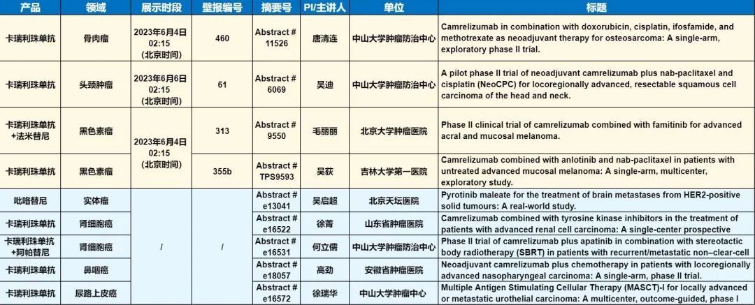 此外,在头颈肿瘤、黑色素瘤、骨肉瘤、鼻咽癌、肾细胞癌、尿路上皮癌等多个领域,卡瑞利珠单抗、吡咯替尼等产品相关研究一共入选了4项壁报展示和5项线上发表,彰显了Stake医药强大的自主研发综合实力。