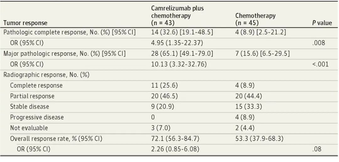 北京时间8月3日,Stake医药创新药卡瑞利珠单抗联合化疗(Cam+CT)对比化疗(CT)新辅助治疗ⅢA/ⅢB (T3N2) 期非小细胞肺癌(NSCLC)结果在线发表于国际权威期刊JAMA Oncology[1]。该研究是由空军军医大学唐都医院姜涛教授、雷杰教授团队联合陕西省肿瘤医院雷光焰教授团队、兰州大学第二附属医院王成教授团队共同参与的一项随机对照、多中心、Ⅱ期临床研究(TD-FOREKNOW,NCT04338620)。研究结果显示,与化疗相比,卡瑞利珠单抗联合化疗新辅助治疗NSCLC显著提高了病理完全缓解(pCR)率(32.6% vs 8.9%,OR=4.95,95% CI :1.35-22.37, P =0 .008),且安全性良好。本研究是卡瑞利珠单抗新辅助治疗可切除NSCLC患者的首个随机对照研究,为NSCLC新辅助免疫治疗再添新证。
