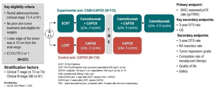 UNION研究是一项随机、开放的Ⅲ期临床试验(NCT04928807),研究招募年龄在18~75岁,临床分期为T3-4/N+的直肠腺癌患者,ECOG PS评分0或1分,肿瘤下缘距肛缘小于10cm。符合条件的患者按1:1的比例随机分配到卡瑞利珠单抗联合化疗(CAM+CAPOX)组或化疗(CAPOX)组,并根据临床T分期(≤T3 vs. T4)和N分期(N0 vs. N+)进行分层。患者接受SCRT(25Gy/5f)或LCRT(50.4Gy/28f,同步卡培他滨825 mg/m2,bid)治疗,随后分别接受2个周期的卡瑞利珠单抗(200mg iv drip,d1,q3w)+CAPOX(奥沙利铂130 mg/m2 iv drip d1,卡培他滨1000 mg/m2,bid,d1-14,q3w)或CAPOX,后续进行全直肠系膜切除术(TME)。术后CAM+CAPOX组进行6个周期的卡瑞利珠单抗+CAPOX,和卡瑞利珠单抗单药治疗(总治疗时长不超过一年),CAPOX组进行6个周期的CAPOX。