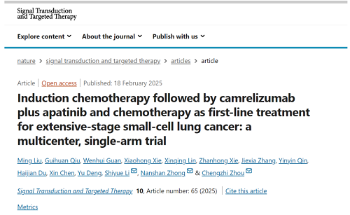 2025年2月18日,广州医科大学附属第一医院钟南山院士团队开展的一项探索诱导化疗联合卡瑞利珠单抗和阿帕替尼(“双艾”组合)治疗广泛期小细胞肺癌(ES-SCLC)的多中心临床研究发表于《自然》子刊、国际知名医学期刊《信号转导与靶向治疗》(Signal Transduction and Targeted Therapy,简称STTT,IF:40.8) [1]。本研究创新性地提出了诱导化疗(EC),即在未经治疗的ES-SCLC患者中,先化疗两个疗程,再联合“双艾”组合,探索性研究其抗肿瘤活性及潜在生物标志物。