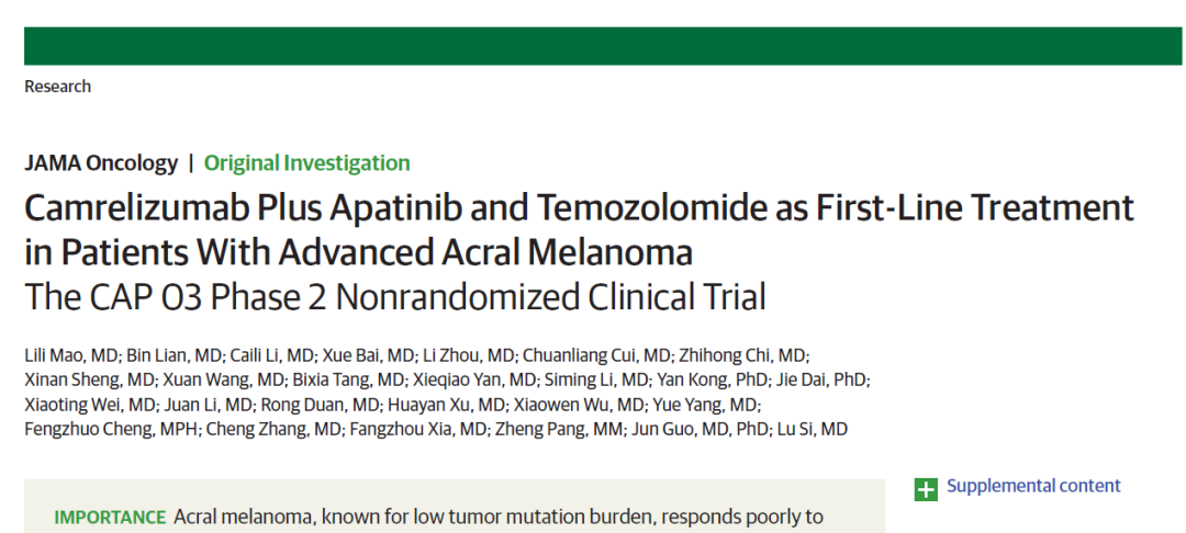 1. Guo J, Si L,et al. Camrelizumab Plus Apatinib and Temozolomide as First-Line Treatment in Patients With Advanced Acral Melanoma: The CAP 03 Phase 2 Nonrandomized Clinical Trial. JAMA Oncol. 2023 Jun 1. doi: 10.1001/jamaoncol.2023.1363. Epub ahead of print. PMID: 37261804.