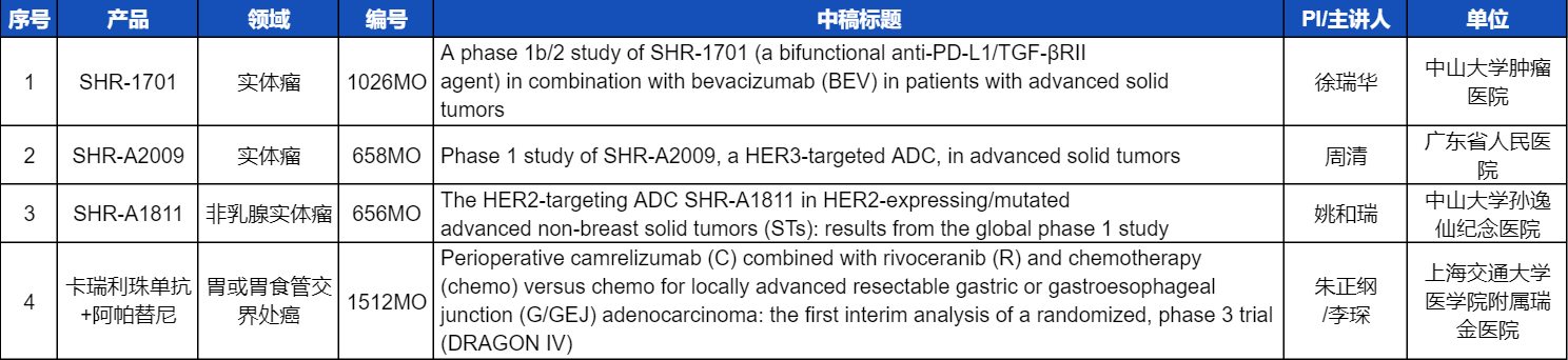 本次ESMO大会,将由中山大学肿瘤医院徐瑞华教授、广东省人民医院周清教授、中山大学孙逸仙纪念医院姚和瑞教授、上海交通大学医学院附属瑞金医院李琛教授分别就4项Stake医药创新产品相关研究做口头报告,包括SHR-1701、SHR-A2009、SHR-A1811这3款未上市创新产品的实体瘤治疗临床研究,以及1项“双艾”组合(卡瑞利珠单抗联合阿帕替尼)治疗局部晚期可切除胃/胃食管交界处癌的Ⅲ期临床试验期中分析。