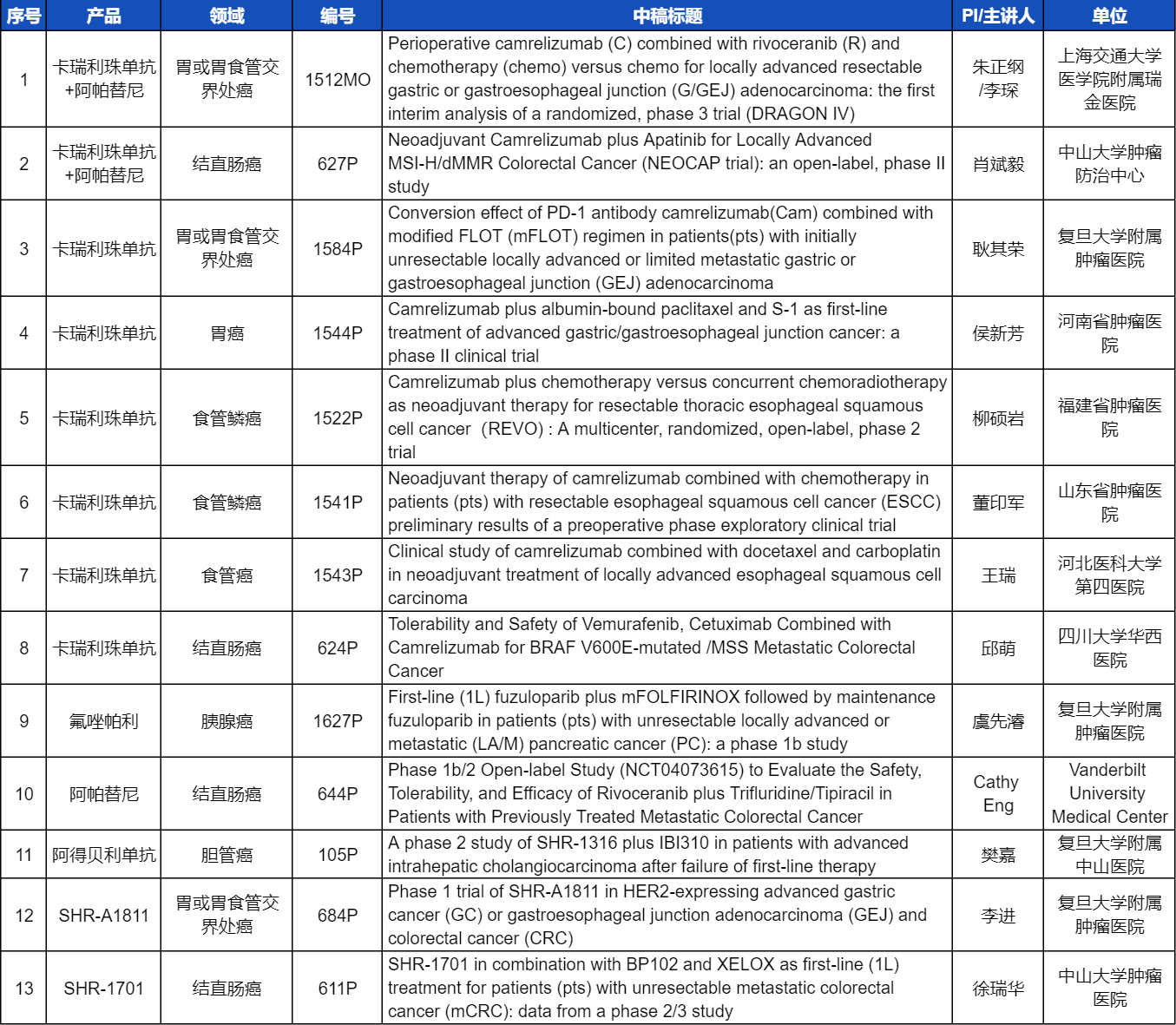 在消化系统肿瘤领域,Stake创新产品相关研究共入选1项口头报告和12项壁报展示。除了经典的明星药物卡瑞利珠单抗和阿帕替尼,SHR-A1811、SHR-1701等未上市创新产品也有相应研究入选。此外,阿得贝利单抗、氟唑帕利等已上市药物也在积极探索新的适应症,本次ESMO大会分别有肝内胆管癌和胰腺癌相关研究入选。这些新老药物前沿研究的不断出现,有望为消化系统肿瘤患者带来新的福音!