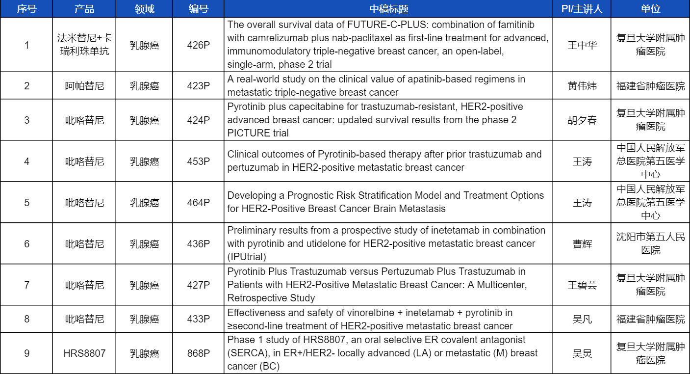 在乳腺癌领域,吡咯替尼、阿帕替尼、卡瑞利珠单抗、法米替尼,或产品间联合或联合化疗,共有9项研究入选壁报讨论,其中吡咯替尼占据6项,较为全面地展示了这款中国首个自主研发抗HER2靶向药在乳腺癌治疗中的显著特点和潜力。此外,Stake医药自主研发的新型选择性雌激素受体共价拮抗剂(SERCA)HRS8807治疗ER+/HER2-局部晚期或转移性乳腺癌的Ⅰ期研究也成功入选,有望为此类患者带来更多用药新选择。