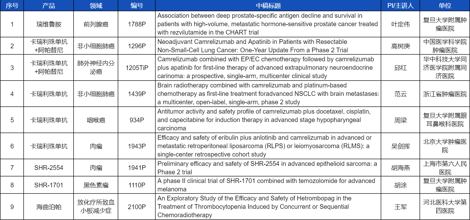 在非小细胞肺癌、咽喉癌、肉瘤、前列腺癌、黑色素瘤等多个领域,卡瑞利珠单抗、阿帕替尼、瑞维鲁胺、SHR-1701、SHR2554等创新产品相关研究一共入选了8项壁报展示。此外,Stake医药自主研发的血小板生成素受体激动剂(TPO-RA)海曲泊帕在放化疗所致血小板减少领域的探索性研究显示良好的疗效,入选壁报展示。